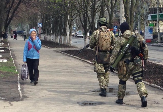 Вооруженные славянцы ходят в масках, многие с ружьями, у кого-то – карабины сайга. Встретил мужика с ППШ с отполированным до блеска прикладом: «Дед завещал». Группа активных женщин взяла в живое кольцо здание ГОВД, где «их дети и мужья». В городе весь день ждали войск.
