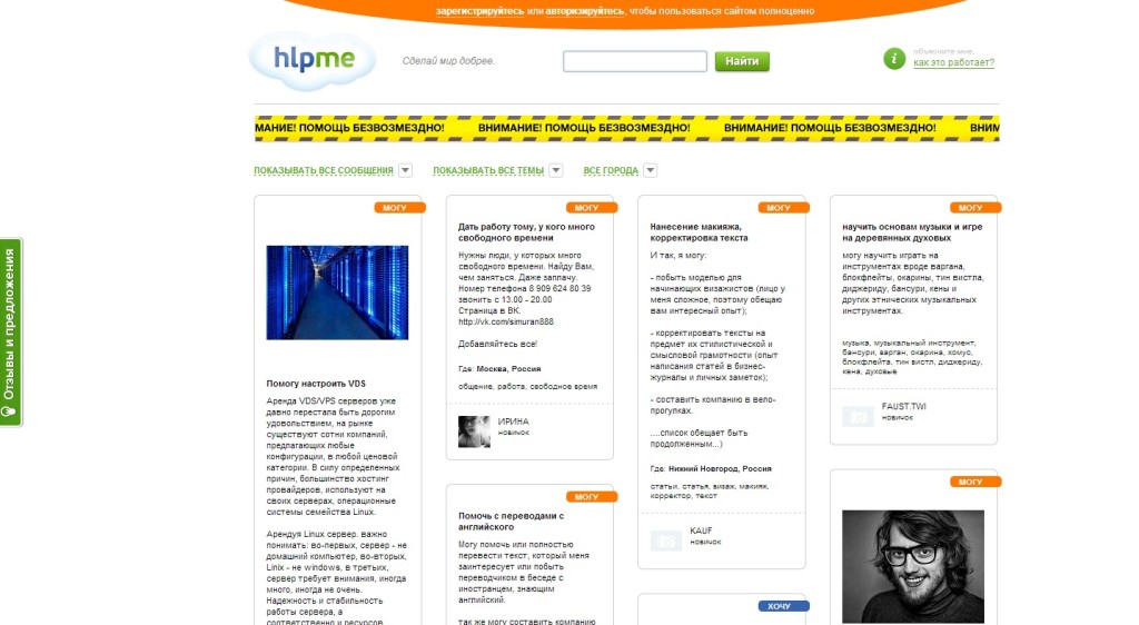 «Hlpme» — сервис безвозмездной помощи, где пользователи предлагают свои услуги в решении различных задач и сами получают поддержку.