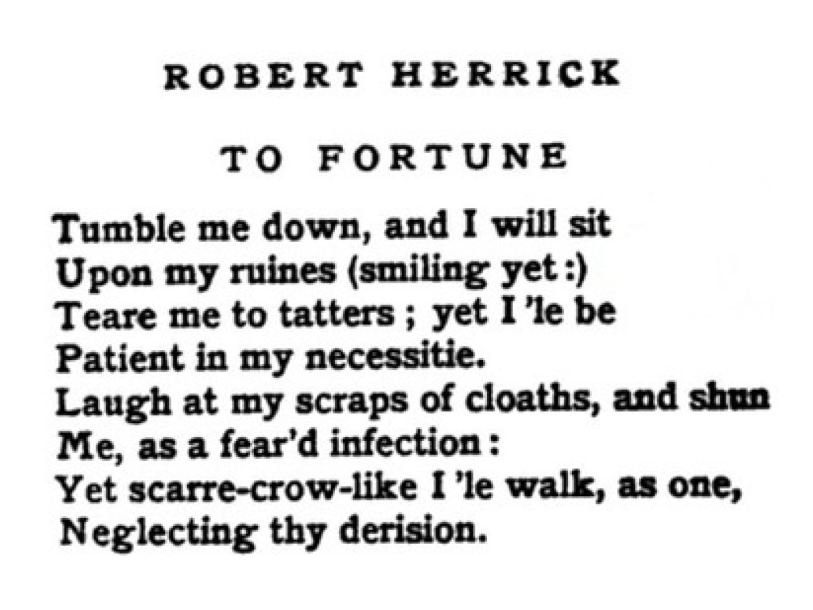 Это стихотворение «К Фортуне», написанное английским поэтом Робертом Херриком (1591–1674). Оно вошло в его единственный прижизненный сборник «Геспериды, или Сочинения светские и духовные». Первые две строчки стихотворения выглядят так:
