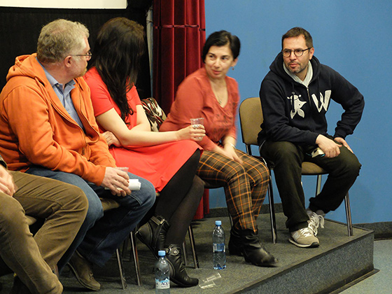 Андрей Титов (из зала): Чем больше фильм не понравится противоборствующим сторонам, тем больше он будет явлением достоверным. Потому что легче всего скатиться в агитку и показать только одного героя, одну сторону, отразить впечатления, которых ждет от тебя либо либеральная общественность, либо пророссийская общественность. Здесь особого ума не надо. Я лично был в Киеве с 4 по 15 января и уехал до первой крови за три дня. И когда говорится, что мы не увидели своего Киева… 4 января я прибывал в один Киев, 15 января это был уже более агрессивный, настороженный, выходящий с отрядами самообороны другой Киев, другое настроение. И немудрено не увидеть своего Киева во всем этом.