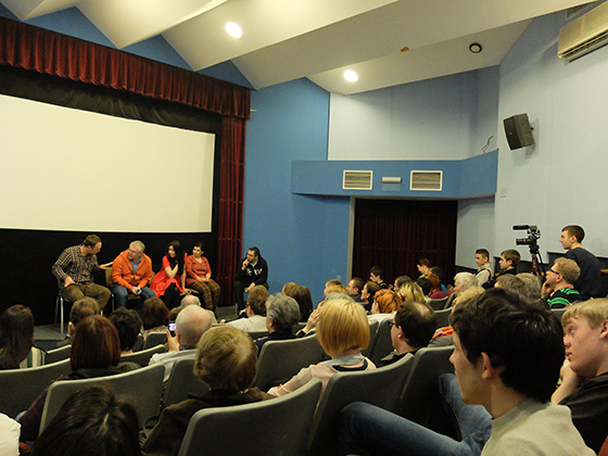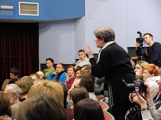 Зритель: Я вас очень прошу, вот эту историю с Антимайданом обязательно вставьте… Я, конечно, смотрел фильм с очень личным отношением, потому что часть моих родственников в Харькове и Днепропетровске, часть друзей в Ровно, есть знакомые в Киеве, и они не принадлежат ни к той, ни к другой активной стороне. Они обычные люди, которые сидят и смотрят, и мы с ними в контакте. Там много страхов, много восхищения, и чувствуется, что страна эта распалась на две части. И если вы это не вставите, то эта линия просто пропадет. Если вы сумеете показать две правды, то это будет, наверное, лучшее, что может сделать художник в вашей ситуации. Пожалуйста!