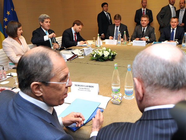 Переговоры в Женеве 17 апреля Фото: United States Government Work Россия, США, ЕС и Украина по итогам переговоров в Женеве 17 апреля приняли документ, предусматривающий конкретные шаги по деэскалации конфликта на Украине. На встрече российскую сторону представлял глава МИД Сергей Лавров, США — госсекретарь Джон Керри, ЕС — глава европейской дипломатии Кэтрин Эштон, Украину — и. о. главы МИД Украины Андрей Дещица.