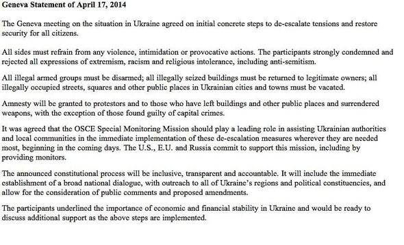 В данный момент следует вспомнить, что 17 апреля в Женеве проходила встреча министров иностранных дел России, Украины, США и ЕС . По поводу Украины. Причем, перед самой встречей в США (а это там были инициаторами) констатировали: "на данный момент общей повестки дня не существует, каждая делегация приедет в Женеву со своими наработками". Учитывая данный факт, вряд ли можно было рассчитывать, что там будет достигнут хоть какой-то результат. Как, скажем, могла стать предметом обсуждения тема федерализма, когда другая сторона примется говорить о деоккупации Крыма и присутствии российских войск на востоке Украины?