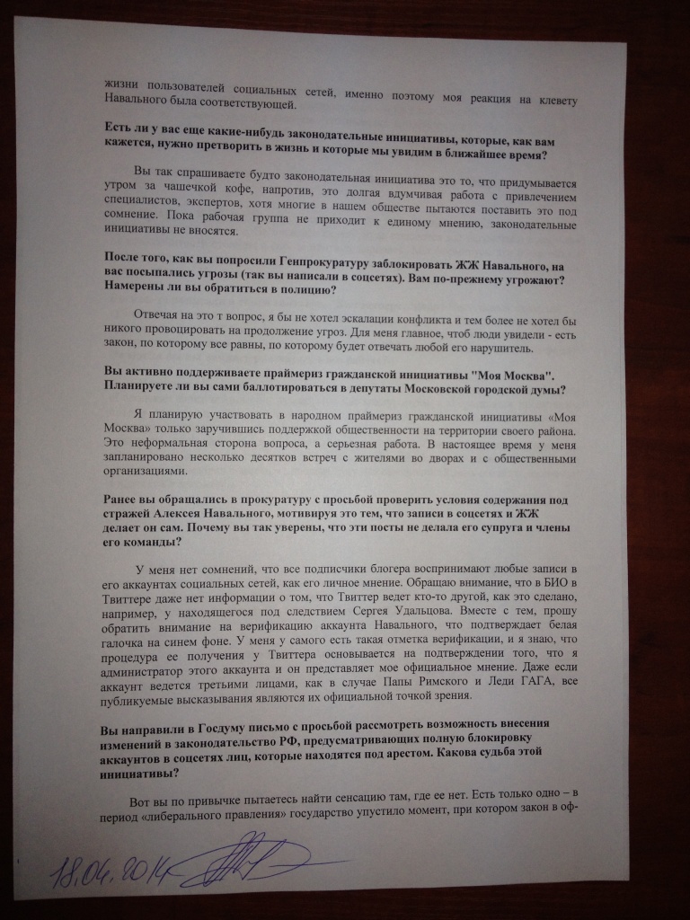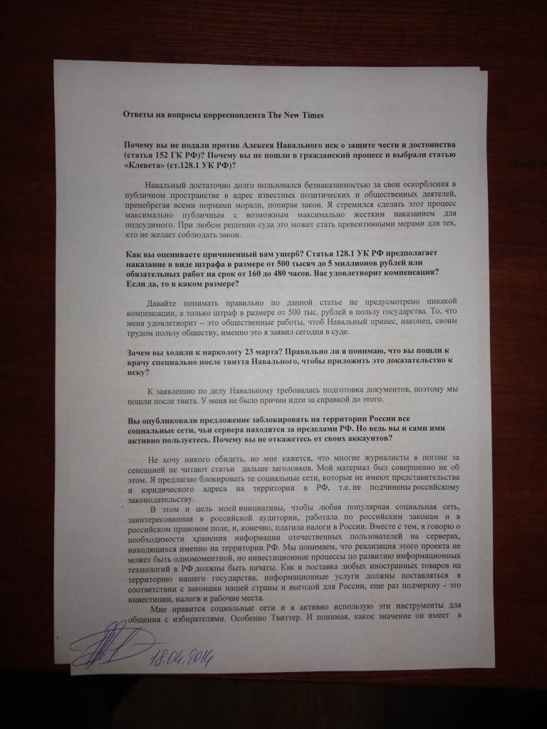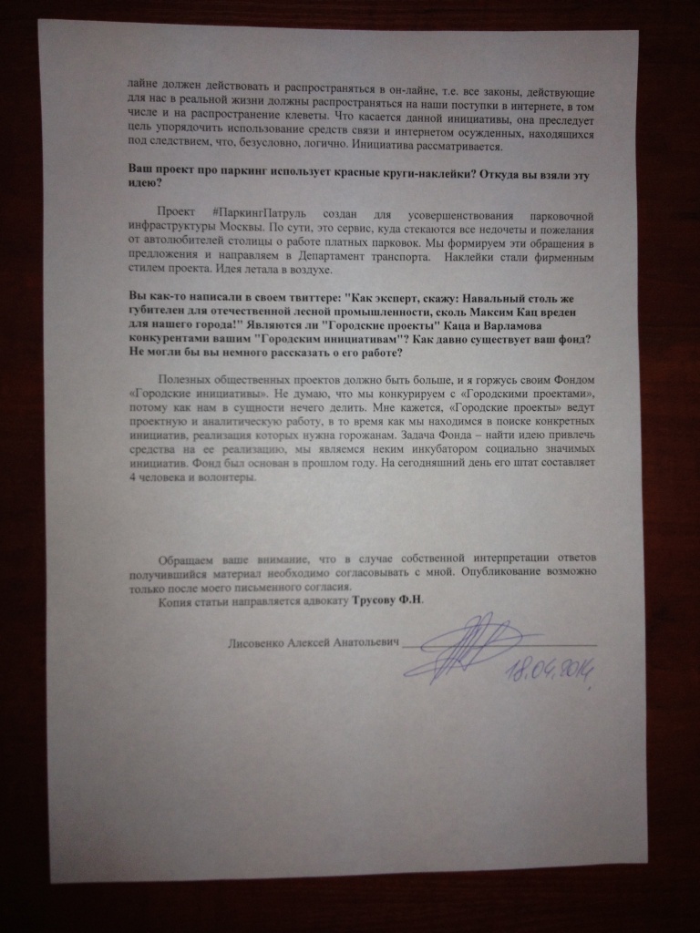 Корреспондент The New Times несколько дней добивался интервью у муниципального депутата Бабушкинского района Алексея Лисовенко, который подал в суд на оппозиционного политика Алексея Навального за твитт про «депутата-наркомана», обвинив его в клевете. Лично поговорить так и не получилось, но г-н Лисовенко прислал ответы по электронной почте. Их сопровождало вот такое письмо: «Обращаем ваше внимание, что в случае собственной интерпретации ответов получившийся материал необходимо согласовывать с мной. Опубликование возможно только после моего письменного согласия. Копия письма направляется адвокату Трусову Ф.Н.»