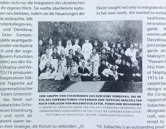 — Да, 1920-х годов. Потом, есть очень интересный материал о связях народного искусства и авангарда, но не в теоретическом плане, а в совершенно практическом. В 1915 году была выставка современного декоративного искусства, на которой были представлены супрематические вышивки, то есть шелковые вышивки по эскизам супрематистов. Эскизы делали Малевич, Экстер, Розанова, самые известные художники-авангардисты. А вышивали украинские народные вышивальщицы из сел Вербовка и Скопцы. Они делали подушки, полотенца, рушники, дамские сумочки.