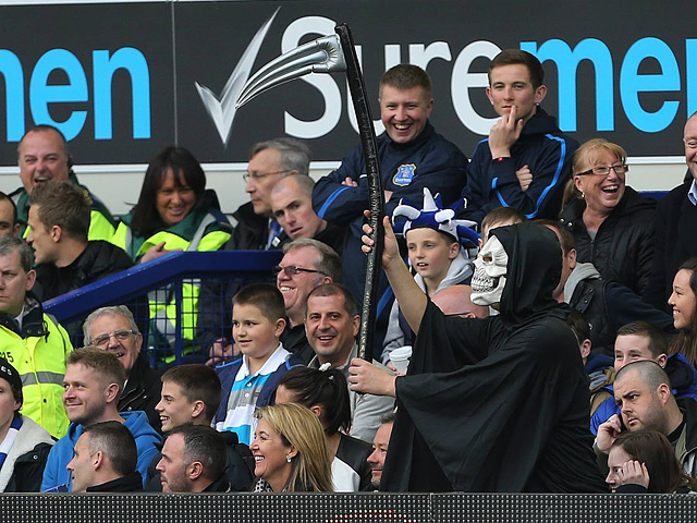 Во время матча чемпионата Англии по футболу "Эвертон" - "Манчестер Юнайтед" в Ливерпуле с трибун арены "Гудисон Парк" за главным тренером гостей Дэвидом Мойесом пристально наблюдал человек в костюме смерти.