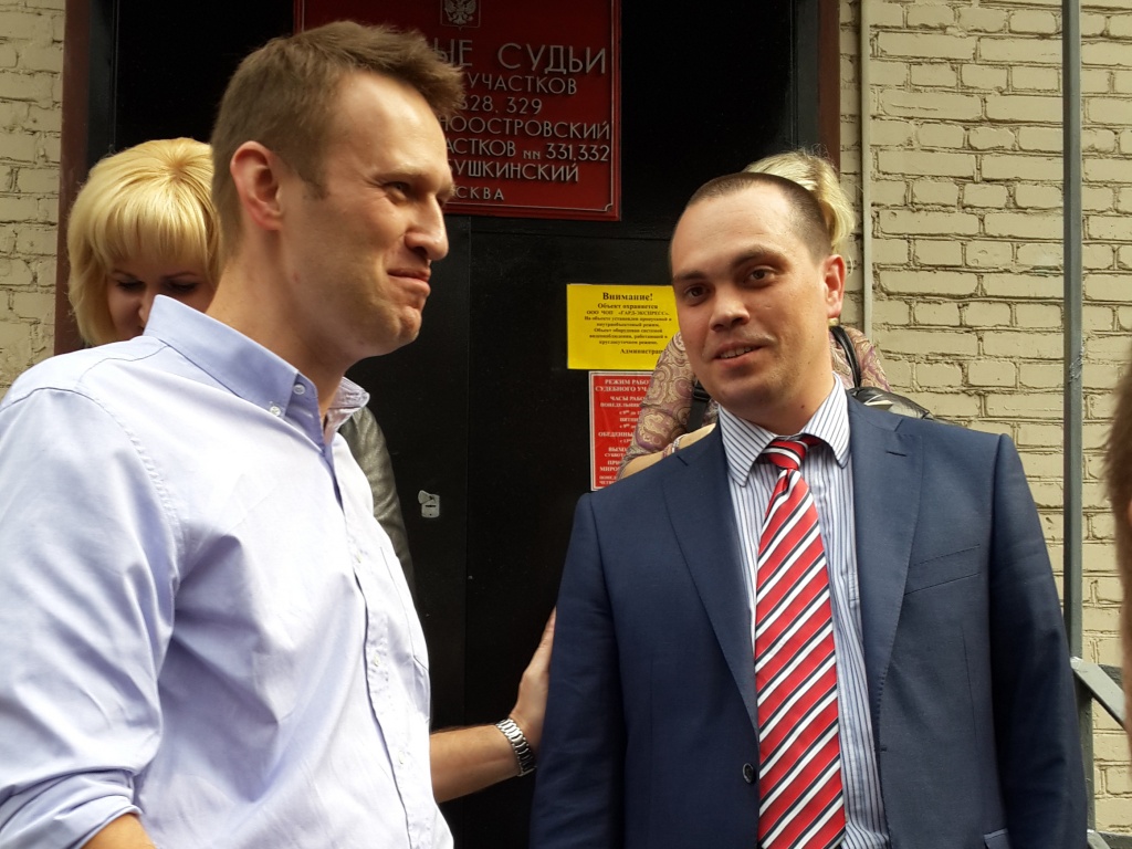 Алексей Навальный (слева) и его адвокат Вадим Кобзев возле здания Бабушкинского суда 22 апреля 2014 года