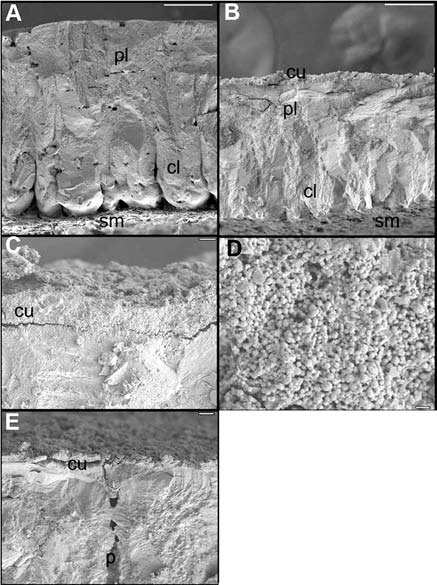 Классическое защитное средство — антимикробный белок лизоцим, однако в яйцах кустарникового большенога его концентрация оказалась практически такой же, как в куриных. Следовательно, разгадку надо искать не внутри, а снаружи яйца. Исследователи сравнили скорлупу куриных яиц и яиц большенога. Как показала электронная микроскопия, скорлупа яйца A. lathami в полтора раза тоньше, чем куриного, но у нее есть дополнительный внешний слой толщиной 16-17 мкм, сложенный из наносфер, образованных фосфатом кальция. Эти наносферы диаметром около 340 нм затыкают часть пор.