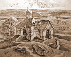 У Петериса Скасткалнса сказано: «Псковщина – это спящий Великан, укрывшийся твердью земной». Вот художник и всматривается в уснувшую землю. Его не слишком интересуют парадные места. В парадных местах слишком мало подлинности. Петерису Скайсткалнсу интереснее там, где тихо. В этой естественной тишине легче расслышать чистые звуки.