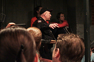© Colta.ru Тем не менее наряд прибыл, и вместе с полицейскими в зал просочились и люди с неизменными георгиевскими ленточками, тоже пришпиленными наспех и криво. Полицейские попросили включить свет, фильм мы остановили, детей в зале как-то не оказалось. Гости, собственно, толком не знали, что им делать дальше, но они хотя бы старательно водили по залу камерами (как выяснилось, это было некое Национально-освободительное движение, однако режиссер Марина Разбежкина, которая была с нами в этот вечер и обсуждала фильм, узнала среди «освободителей» нескольких людей, тролливших разные мероприятия вместе с Дмитрием Энтео).