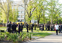 "Горсовет забрали. Принимали жестко, есть раненые, - написали они - В здании забаррикадировались неизвестные люди. По периметру выставлено оцепление. В ГУВД видели людей в милицейской форме даже с пулеметом", - цитирует агентство заявление боевиков.