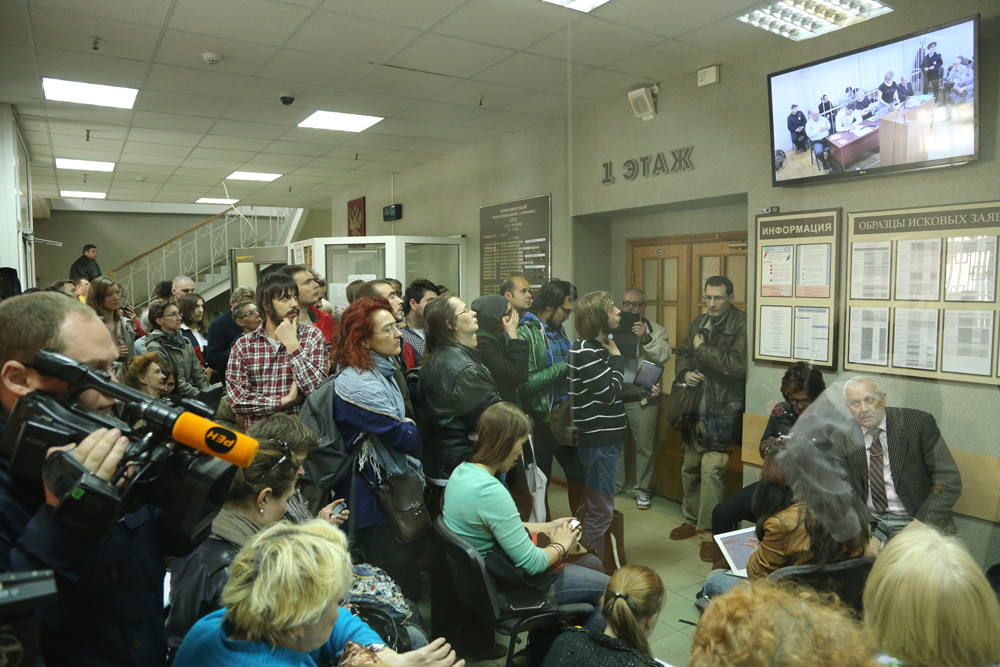 Журналисты, которые приехали в Замоскворецкий суд 24 апреля, следили сразу за двумя процессами, назначенными на один день: «Болотное дело-2» и «дело братьев Навальных» /фото: Виталий Качанюк