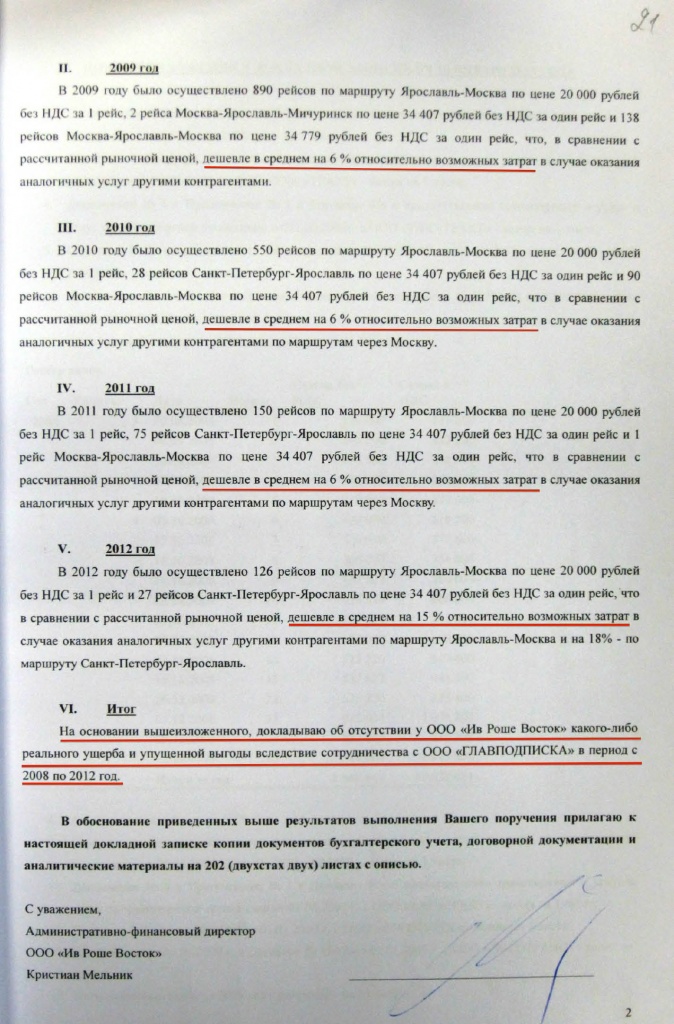 Страница из докладной записки административно-финансового директора ООО «Ив Роше Восток» Кристиана Мельника. Записка датирована 10 января 2013 г. и есть в материалах дела