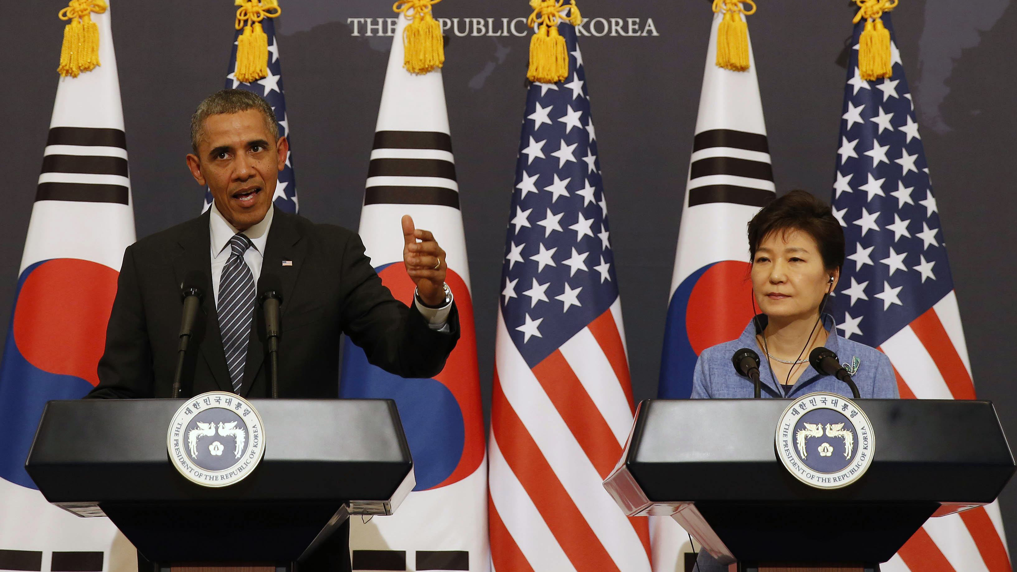 Прибытие Барака Обамы в Сеул Северная Корея намеревалась отметить четвертым по счету ядерным испытанием, как было заявлено, "нового типа". Под этим, возможно, имелся в виду взрыв уранового, а не плутониевого заряда, который был задействован в первых трех испытаниях. Либо первый тест миниатюризованного боеприпаса, которым единственно и могут быть оборудованы межконтинентальные баллистические ракеты, если Пхеньян хочет, чтобы они могли поражать цели на американском континенте. И то, и другое явилось бы прорывом в ракетно-ядерных разработках КНДР. Однако пока президент был в Сеуле, ничего не произошло. В субботу Барак Обама покинул Южную Корею, но приготовления Севера к ядерному испытанию как будто продолжаются. Канонада, которая действительно предшествовала прилету американского гостя в Сеул, была конвенциональной: между Севером и Югом произошла интенсивная, хотя и бескровная, артиллерийская дуэль. В прошлом, не имея опоры в лице живого американского президента, Юг старался не отвечать силовым образом на вооруженные провокации Севера. Перед отлетом из страны Обама заявил: "Соединенные Штаты не используют свою военную мощь ради установления господства над другими странами, но применят ее, не колеблясь, чтобы защитить национальную безопасность Южной Кореи и наши общие ценности". Президент также обещал умножить усилия, направленные на то, чтобы не допустить превращения КНДР в ядерную державу.