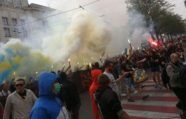 ПСобытия в Харькове. Фото: glavnoe.ua Комментарий редактора: Вечером 27 апреля в городе от площади Конституции до стадиона «Металлист» проходило шествие фанатов футбольных клубов «Днепр» и «Металлист» в поддержку единства Украины. По сведениям милиции, в акции принимали участие как минимум 5 тысяч человек. Болельщики скандировали лозунги за единство Украины, а также выкрикивали лозунги Евромайдана. Как сообщалось, на шествие напали антимайдановцы с георгиевскими ленточками, митинговавшие в поддержку федерализации на площади Свободы. Между участниками акций вспыхнула драка, в результате которой 14 человек, в том числе два милиционера, получили травмы. Шестеро пострадавших получили медицинскую помощь на месте, восьмерым потребовалась госпитализация. Участники драки, по данным милиции, использовали биты и палки. Как позднее заявили в МВД, драка с фанатами была спровоцирована сепаратистами. Ранее 23 апреля в Харькове проходили митинги, на которые вышли сторонники референдума по вопросу федерализации страны и приверженцы единой Украины, однако тогда столкновений удалось избежать.