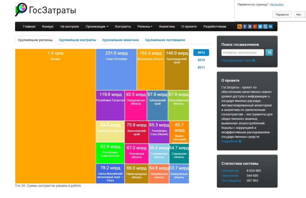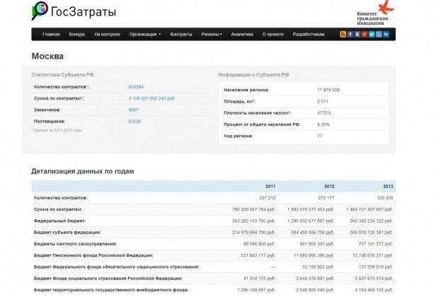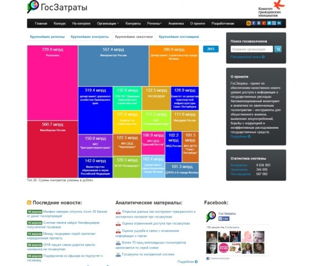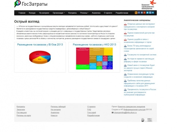 Большое внимание проект уделяет сбору статистики и ее визуализации. С помощью наглядных таблиц пользователи могут узнать, какие регионы страны являются лидерами по количеству выполненных заказов; сколько миллиардов рублей было потрачено на нужды Роскосмоса и Министерства обороны; какие организации заработали больше всего на оказании услуг и поставке товаров государственным и муниципальным учреждениям. На сайте имеется аналитический раздел, на данный момент в нем представлены два отчета. Они посвящены крупнейшим поставщикам товаров и услуг государству среди НКО и вузов.