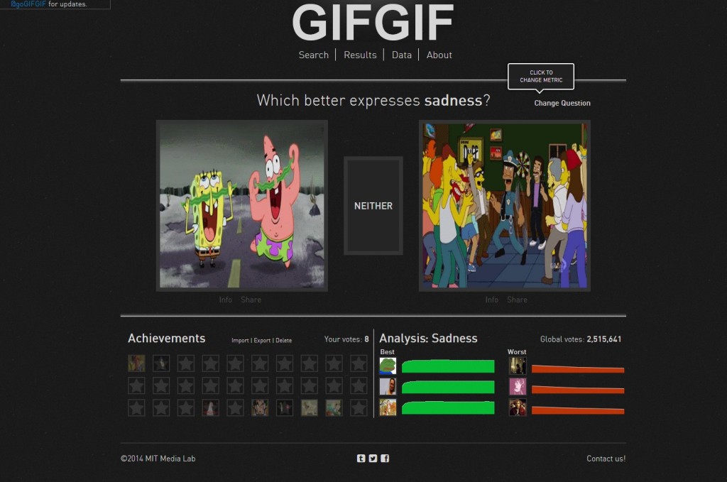 Недавно создатели GIFGIF дали интервью GamicationCorp., в котором рассказали о разработанной ими механике, использовании собранных данных в исследовании культурных и этических особенностей различных категорий пользователей и применении результатов проекта в мире большой науки.