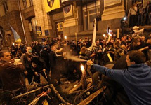 Накануне вечером несколько десятков неизвестных в масках устроили шествие с факелами со стороны Бессарабской площади в направлении Майдана. Свою акцию они якобы посвятили памяти героев "Небесной сотни" - погибших в ходе вооруженного противостояния в Киеве. При попытке пройти через баррикады Майдана в направлении Институтской улицы участники шествия были остановлены активистами самообороны Майдана. Между ними возник конфликт, так как участники шествия отказывались снимать маски и пытались прорваться на Майдан через проход со стороны Главпочтамта. Началась драка, в результате которой несколько человек получили травмы. После этого неизвестные отошли от баррикад.