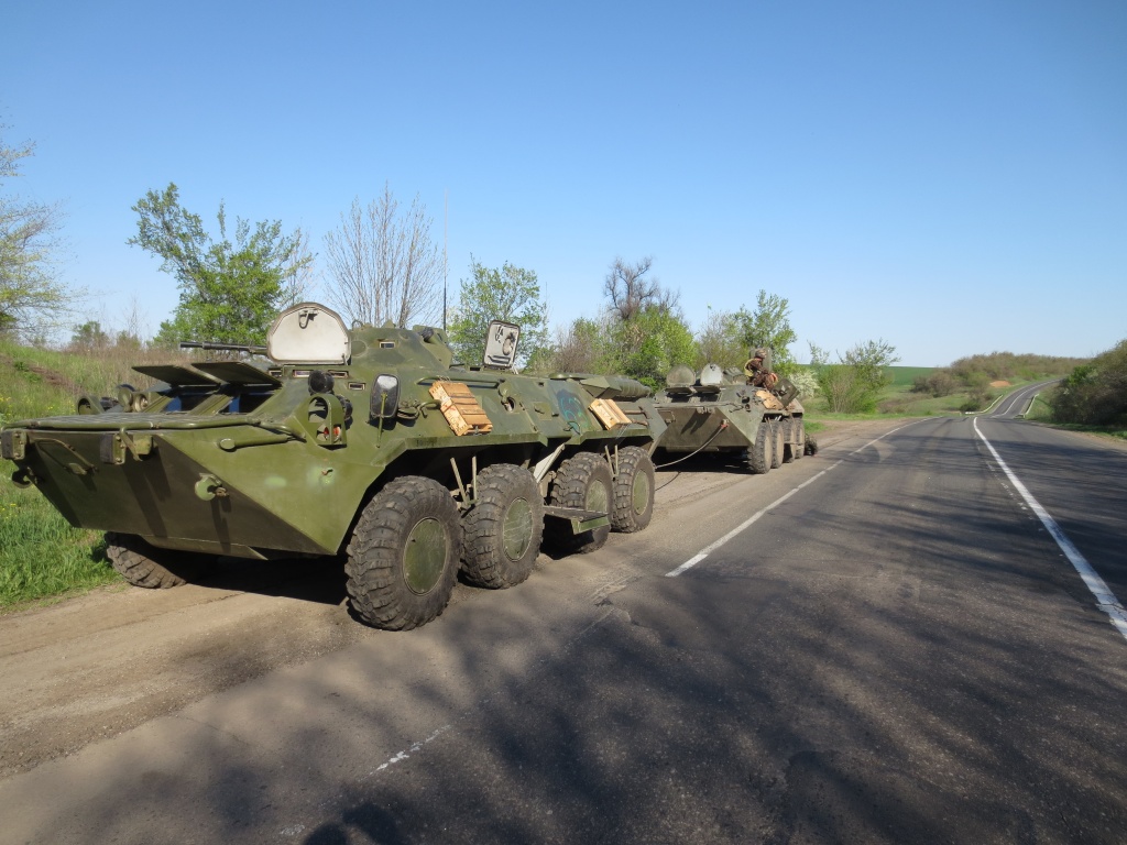 Через несколько километров два БТРа. Один тащит второй на тросе. Заклинило заднюю ось. Под днищем ковыряется водитель. Боевое охранение — два человека — курит на солнышке. В стоящей рядом машине автоинспекции спят два гаишника. Ноги в кроссовках торчат из окон. Даже не выходят, когда мы останавливаемся поговорить. Как-то все очень расслабленно. Эту расслабленность я помню по Чечне. Как известно, ничего хорошего из этого не вышло.На втором, последнем перед Славянском, блок-посту обстановка более напряженная. Здесь круг войны уже чувствуется. Здесь люди уже не так расслаблены. До блок-поста сепаратистов всего восемь километров, он, где-то там, за зеленкой.