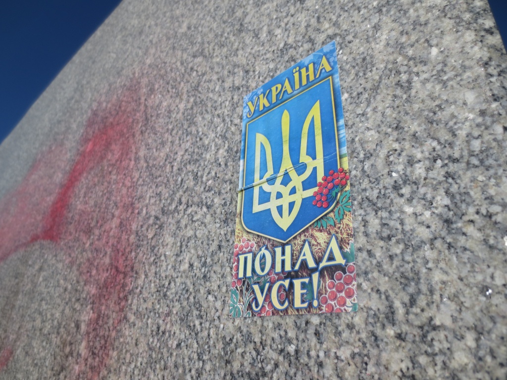 В администрации, над которой развивается украинский флаг, тоже пусто. Суббота. Война-войной, а выходные по расписанию. На памятнике Ленину наклейка - "Украина понад усе". Больше ничего.