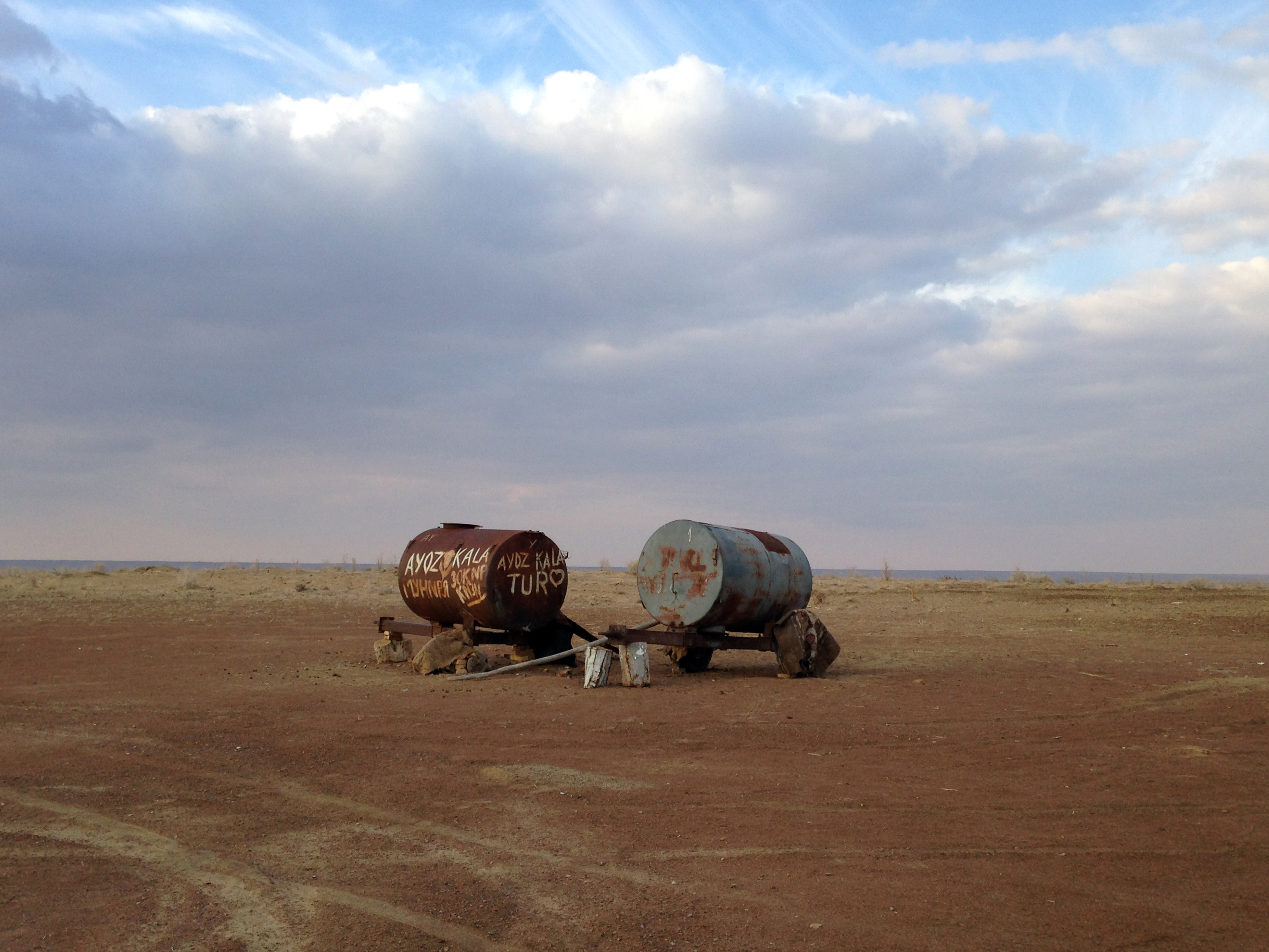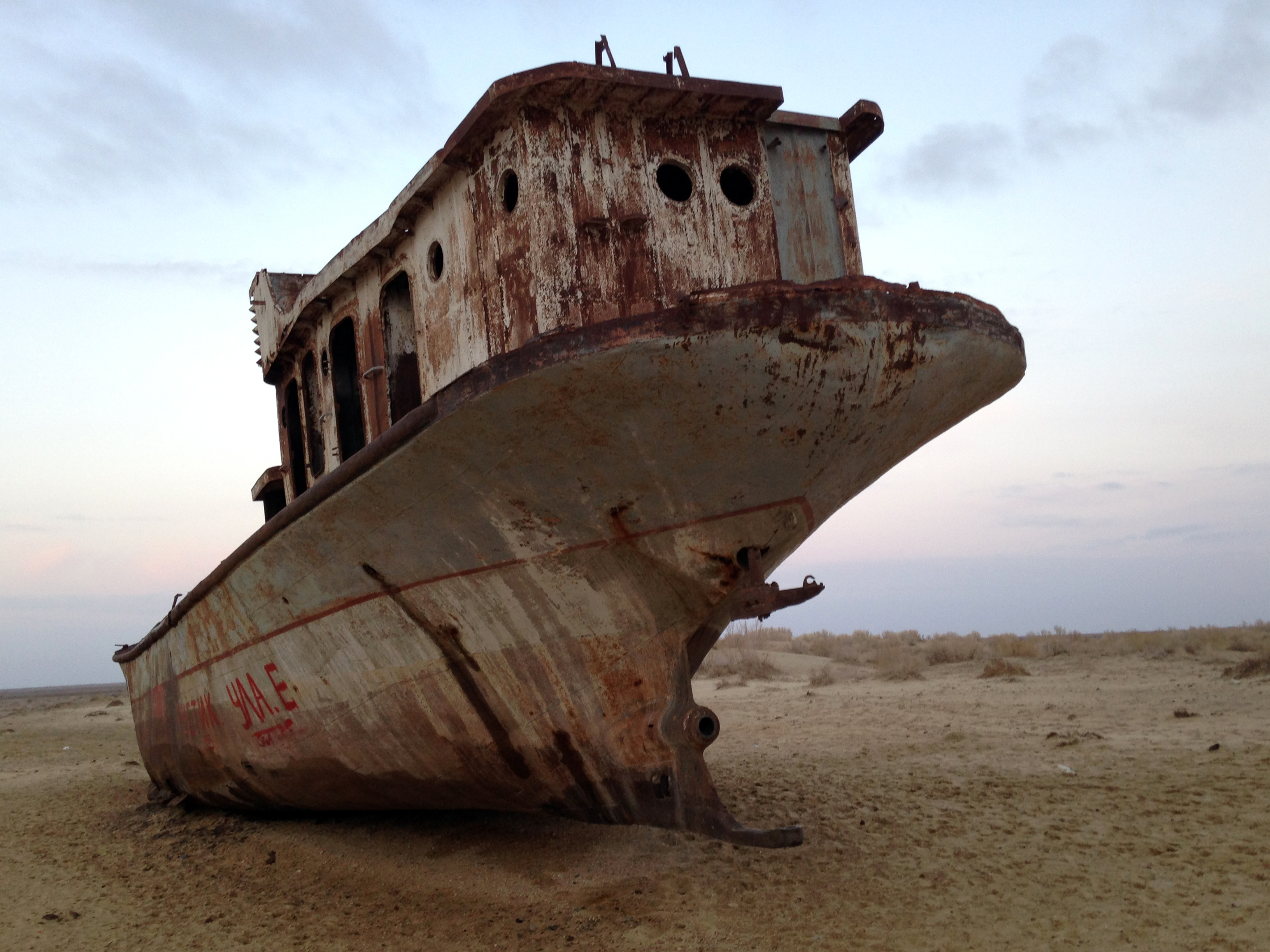 Страшная дорога в Муйнак, лунный пейзаж. Едем мимо тугайных лесов, где некогда колобродил туранский тигр. Муйнак прежде стоял на полуострове, теперь Аральское море ушло совсем, остались только ржавые корабли, штук 15. Когда-то было в 10 раз больше, но корыстный хаким отправил их в металлолом, убив великий туристический аттракцион. Надписи на сирых домах прославляют Олимпиаду-80 и 60-летие СССР. На бывшем берегу памятник советским воинам, но перед визитом Пан Ги Муна убрали красную звезду, стерли имена погибших и все халтурно перекрасили, так что теперь это памятник ничему.