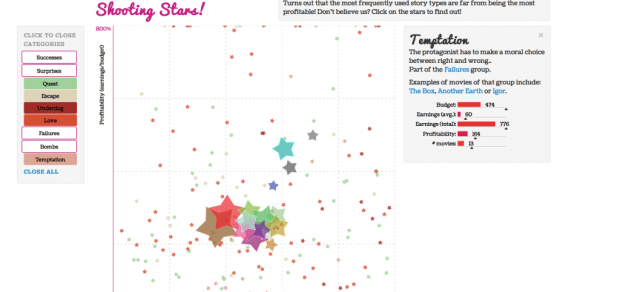 Визуализация Shooting stars! — это ироничная вариация на тему традиционных графиков. В данной визуализации вы можете наблюдать классификацию фильмов по типу сценария и успешности в прокате (вы знали, что фильмы с самыми популярными сюжетами не самые успешные?).