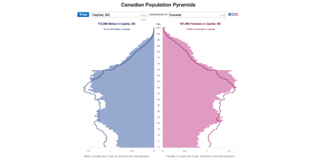 D3 может быть использован для создания и традиционных графиков, с которыми можно взаимодействовать, так, например, интерактивная визуализация CanadianPopulationPyramids показывает возрастное распределение населения Канады.