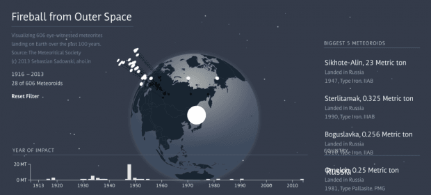 Fireball from Outer Space — это интерактивная визуализация метеоритов, упавших на Землю за последние 100 лет. D3 поддерживает географические проекции, в том числе используемую здесь трехмерную проекцию, что делает его мощным инструментом для картографирования.