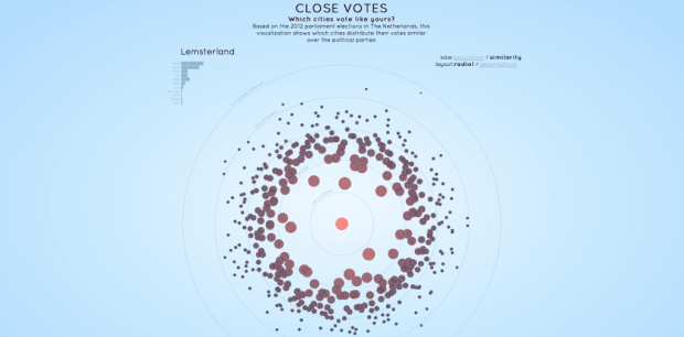 Основанная на парламентских выборах 2012 г. в Нидерландах визуализация CloseVotes показывает, в каких городах голоса избирателей распределились похожим образом. Кроме того, данная визуализация хорошо демонстрирует возможности D3 в быстром переключении между различными вариантами отображения визуализаций — географическом и радиальном.