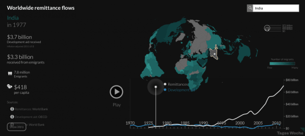 Визуализация The incredible rise of migrants’ remittances рассказывает о глобальной миграции и экономике. На графике показано количество средств, которое мигранты высылают в свои страны, начиная с 1970 года. Кликнув на страну, можно просмотреть дополнительную информацию о ней.