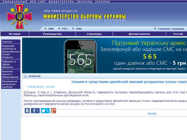 Украинские силовики применили авиацию 5 мая в районе Славянска с целью уничтожения вагонов для перевозки угля, из которых, по утверждению Киева, силы самообороны пытались сделать бронепоезд, сообщает пресс-служба Минобороны Украины.