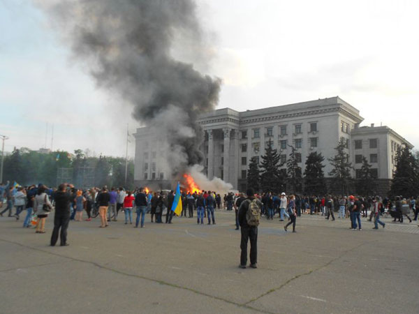 Фото: 048.uaWashington Post: «В пятницу вечером проукраинская толпа напала на лагерь, где пророссийские активисты поставили палатки, и вынудили их спрятаться в находящемся поблизости правительственном здании, сказал очевидец. Тогда толпа стала бросать в здание коктейли Молотова. По сообщениям полиции, 31 человек погиб, задохнувшись дымом или прыгая из окон. Проукраинская активистка Диана Берг, когда ее спросили, кто бросал снаряды, сказала: "наши люди – но теперь они помогают им выбраться из здания"». «Обратите внимание, - комментирует Пэрри, - как Times старательно избегает возлагать ответственность на толпу сторонников переворота за попытки выжечь "пророссийских активистов" из здания... Из этого репортажа даже непонятно, кто погиб в здании и кто его поджег».