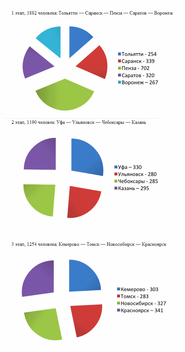 Startup Tour был разбит на 6 этапов - 6 недель. Мы разделили города на территориальные группы и посещали по 4-5 городов в неделю. После недельного заезда по городам одной группы неделя или две отводились на восстановление и подготовку к следующей группе. В 27 городах мы посмотрели 469 проектов. Из них 87 проектов мы пригласили участвовать в Startup Village.