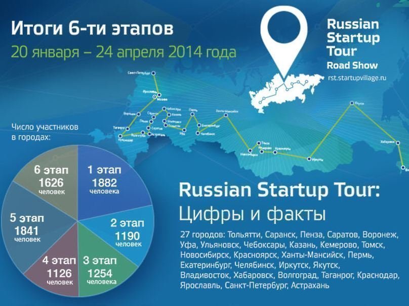 Когда в 2013 году мы начали планировать Russian Startup Tour с посещением 16 городов, случайно выяснилось, что коллеги из Росмолодежи тоже собираются проводить мероприятия в регионах на инновационную тему. Мы решили с ними объединиться и привлекли еще в качестве партнера РВК. Тогда Startup Tour мы проводили втроем, а в этом, 2014 году, к нам присоединился Фонд инфраструктурных и образовательных программ и количество посещаемых городов увеличилось с 16 до 27.