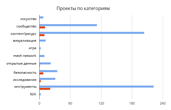 То, что доминирующими категориями на первом графике оказались сообщество, контент/ресурс и инструменты, не удивительно. Учитывая, что Knight Foundation часто финансирует проекты в области технологии и журналистские проекты, логично, что много людей подают именно такие проекты — новостные сайты и инструменты, дающие возможности для гражданского участия. Неожиданными стали другие, небольшие категории.