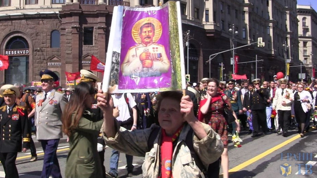 День Победы на Тверской: детский восторг при виде военной техники и шествие КПРФ во славу Сталина и в поддержку юго-востока "советской Украины". Полиция не дала участникам шествия поглумиться над флагами Евросоюза, НАТО, США и УПА.