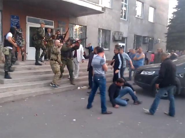 Пользователь "ВКонтакте" Мария Медведева выложила видео, на котором запечатлено, как один из автоматчиков сначала стрелял в воздух, а потом - в человека в упор. Один из трех вооруженных людей не прятал лицо.
