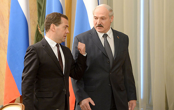 Дмитрий Медведев и Александр Лукашенко. Фото: president.gov.by Несмотря на расплывчатость формулировки, в Белоруссии слова российского премьера были восприняты однозначно как обещание отменить изъятие экспортных пошлин на нефтепродукты с 2015 года — именно на этот срок намечено начало работы Евразийского экономического союза.
