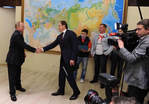 На фото: Россия. Сочи. 12 мая. Президент России Владимир Путин и губернатор Красноярского края Лев Кузнецов (слева направо) во время встречи в резиденции "Бочаров ручей".