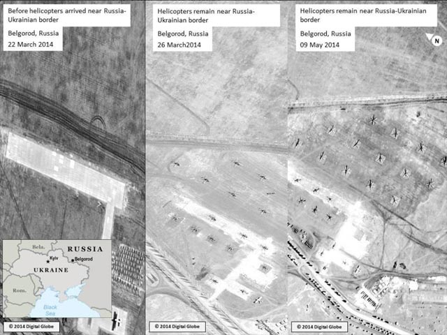 Снимки, опубликованные Госдепом, также показывают, что 9 мая около 20 российских вертолетов находились в районе Белгорода, рядом с украинской границей. Вертолеты показаны и на фотографии той же площадки от 26 марта, тогда как на снимке от 22 марта их нет.