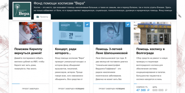 Фонд «Вера» запустил на сайте Planeta.ru самое большое число кампаний среди НКО — 26. Несмотря на сложность темы — фонд часто сталкивается с мнением, что лучше пожертвовать деньги на помощь тем, кого можно спасти, — около половины из них закончились успехом. Благодаря поддержке доноров несколько раз было приобретено питание для неизлечимо больных детей, средства по уходу за пациентами и оборудование для хосписа.