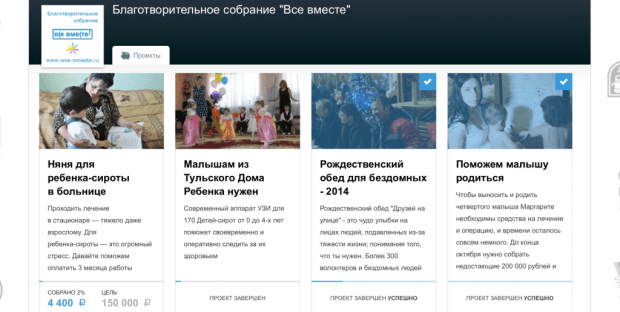 На платформе Planeta.ru собрание «Все вместе» запустило много разных проектов, почти все из которых закончились успехом — благодаря поддержке доноров в школе-интернате в Кировской области появился Интернет, «Все вместе» помогли бездомным, детям в детских домах и маленьким посетителям библиотек.