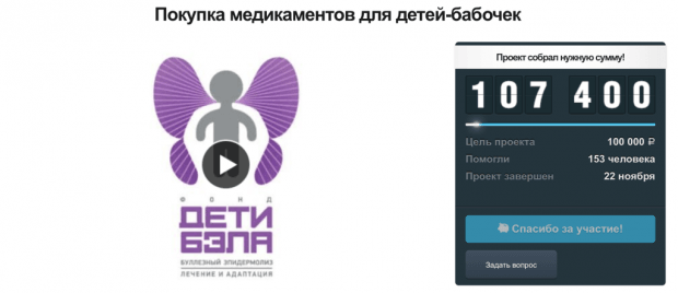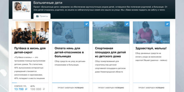 Из пяти проектов «Больничных детей» четыре закончились успешно, а один еще продолжается. При этом кампания «Оплата нянь для детей-отказников в больницах», которая проводилась во второй раз, собрала более 200 тысяч рублей вместо 50 тысяч, которые просили «Больничные дети».