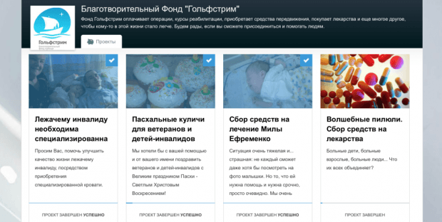 Помимо сбора средств, в помощь на своем сайте «Гольфстрим» запустил на краудфандинговой платформе Planeta.ru пять кампаний — четыре из них закончились успешно. Благодаря поддержке доноров фонду удалось собрать необходимые средства на лечение и помощь людям, находящимся в сложной ситуации.