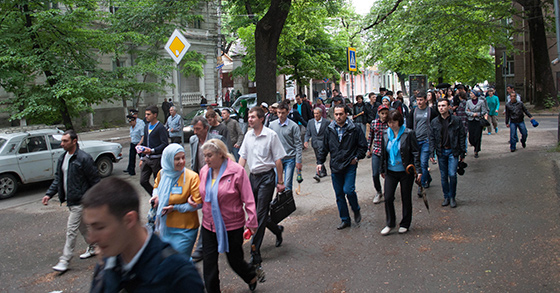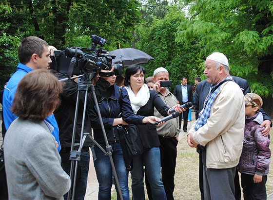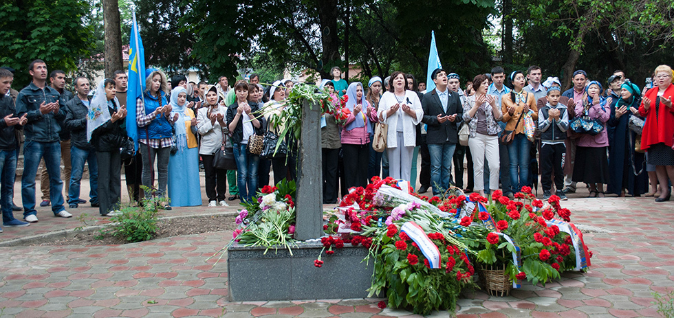 У Ак-мечети — огромная толпа, несколько тысяч. Лидер меджлиса Рефат Чубаров говорит что-то на крымско-татарском. За ним слово берет Дилявер Акиев — по-русски: «Преступления, совершенные коммунистическим режимом против крымских татар, приравниваются к геноциду». Звучат имена Андрея Сахарова и Людмилы Алексеевой. Акиев рассказывает о том, как сегодня вежливые люди врываются в татарские дома с обысками. И запрещают мирные шествия. «Вопиющим беззаконием стал запрет на въезд в Крым Мустафы Джемилева».