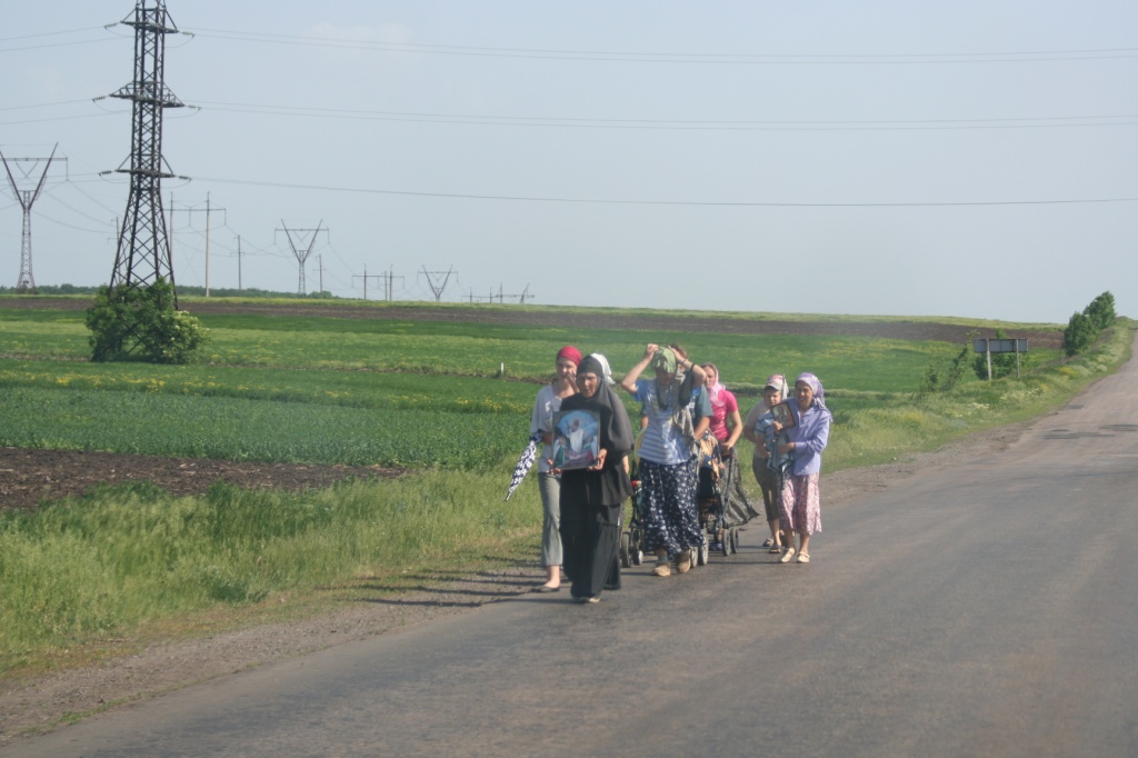 Дальше по дороге встречается небольшая группа людей. В основном женщины. Крестный ход. Молятся за мир. От этой войны устали уже все. Лица сосредоточенные, напряженные. Незнакомым людям здесь уже перестали доверять. Улыбок почти не встретишь. Первым делом от тебя ждут опасности.
