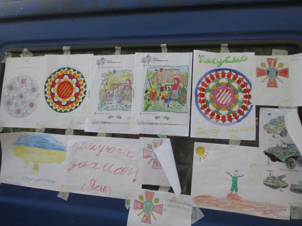 На борту автобуса — детские рисунки, которые школьники присылают солдатам на передовую. К таким вещам на войне относятся крайне серьезно. Вообще, человеческие чувства здесь воспринимаются совсем по-другому. Их очень ценишь. Осознание возможности собственной смерти, пусть и гипотетической (в свою гибель до конца все же не верит никто) обостряет ощущение жизни до остроты бритвенного лезвия. Сентиментальность на войне гипертрофируется в той же пропорции, что и цинизм. Даже не сентиментальность, а... В общем, начинаешь понимать, что в жизни главное. Что действительно ценно, а что — так, шелуха. Вот эти детские рисунки про мир от незнакомых учеников 1-го “В” класса 130-ой школы города Киева , прилепленные на борт военного автобуса — действительно ценно. Ни шуточек ни пренебрежения по отношению к ним никто не допускает: показывают в первую очередь. Чувствуется — гордятся.