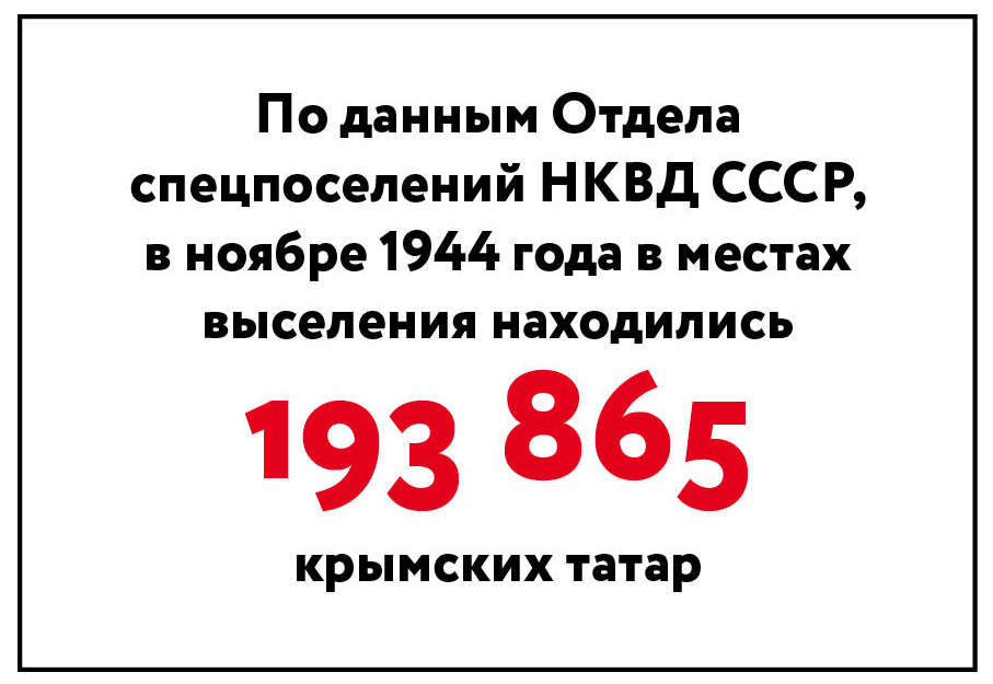 По данным Отдела спецпоселений НКВД CCCР, в ноябре 1944 года в местах выселения находились 193 865 крымских татар, из них в Узбекистане — 151 136, в Марийской АССР — 8597, в Казахской ССР — 4286, остальные были распределены «для использования на работах» в Молотовской (10 555), Кемеровской (6743), Горьковской (5095), Свердловской (3594), Ивановской (2800), Ярославской (1059) областях РСФСР.