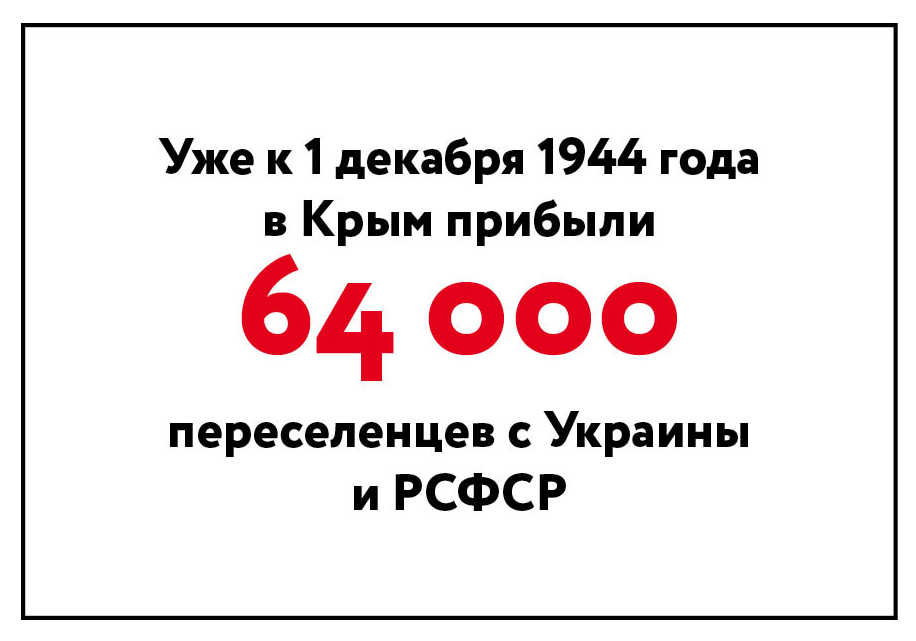 Уже к 1 декабря 1944 года в Крым прибыли 64 000 переселенцев с Украины и РСФСР, в том числе 30 444 трудоспособных.