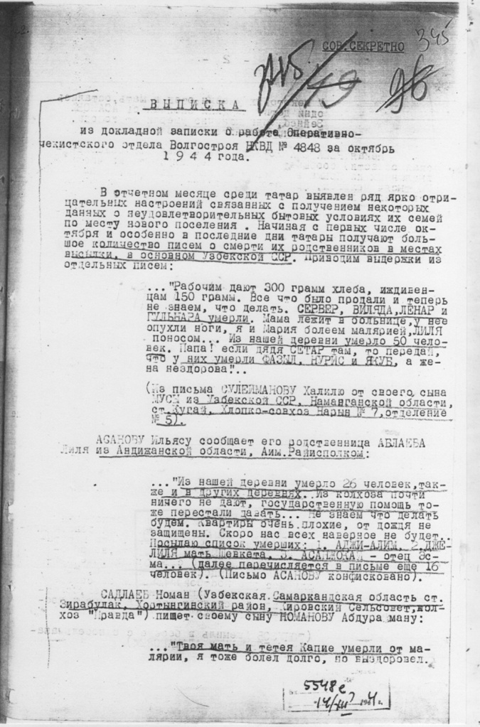 10 мая 1944 года Берия внес на рассмотрение Сталину проект решения Государственного комитета обороны о выселении всех крымских татар с территории Крыма — «учитывая предательские действия крымских татар против советского народа и исходя из нежелательности дальнейшего проживания крымских татар на пограничной окраине Советского Союза». Уже на следующий день «отец народов» подписал постановление ГКО № 5859сс «О крымских татарах»: все, поголовно все — от грудных детей до 90-летних стариков, — должны были быть депортированы. Раньше та же участь коснулась балкарцев, ингушей, калмыков, карачаевцев, корейцев, немцев, чеченцев. Поэтому механизм депортации к моменту выселения крымских татар был апробирован: детально расписаны время на сборы, маршруты следования — Узбекистан, Казахстан, Сибирь и т. д., заранее уточнены адреса проживания крымско-татарских семей в городах и поселках со смешанным населением, во всех селах, населенных крымскими татарами, размещены войска НКВД.